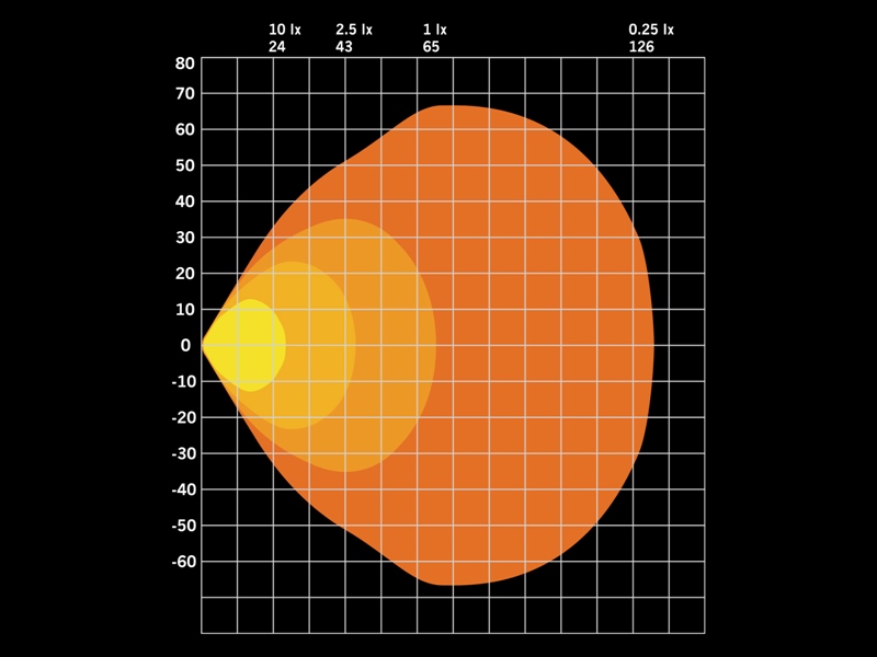 Lyset er på imponerende 7200 lumen, 6500 kelvin og en rækkevidde på 65 meter med 1 lux. Med No-Glare-linsen er den øverste del af lyskeglen afskåret og blødgjort, hvilket mindsker blænding.