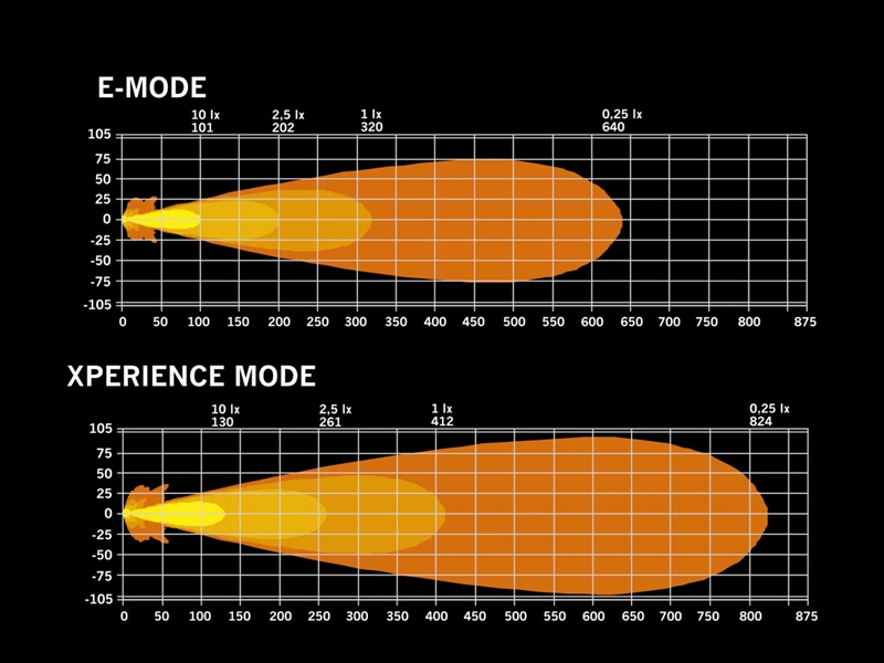 IZE har et E-godkendt fjernlys, der er til brug på offentlig vej men samtig også et IKKE E-godkendt fjernlys (Xperience-tilstand). Det E-godkendte fjernlys har 4600 lumen og 1 lux ved 320 meter, hvor det IKKE E-godkendte (Xperience-tilstand) fjernlys har 9400 lumen og 1 lux ved 412 meter.