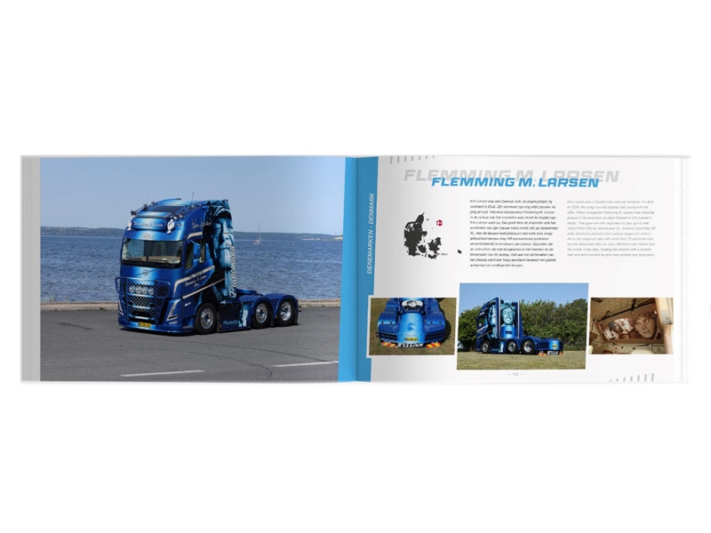 Udover mange billeder af hver lastbil, er der også en fortælling om vognmandens historie, skrevet på Engelsk og Hollandsk.