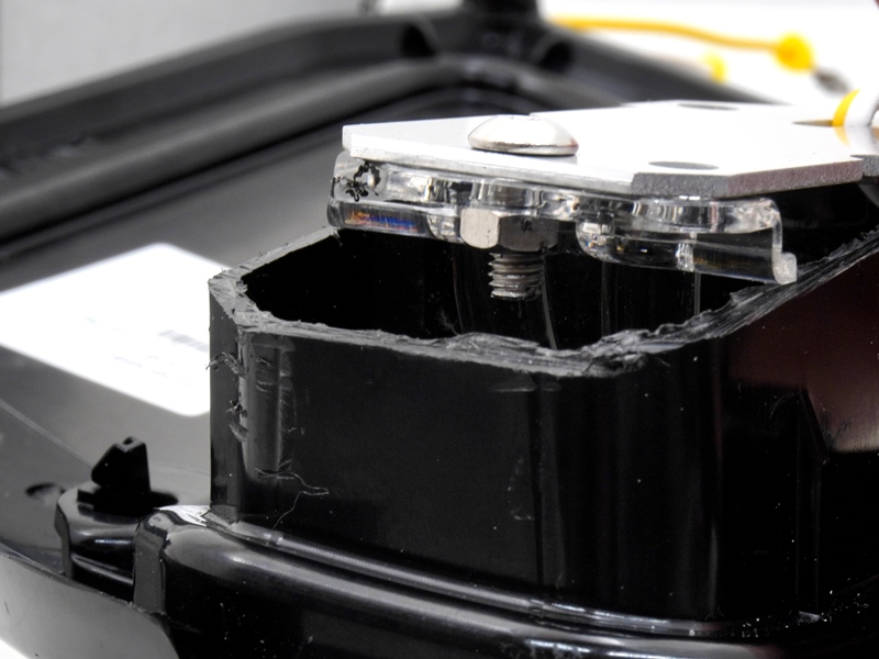 Når toppen er skåret op hele vejen, kan det trækkes lidt ud, og man vil kunne se det originale print. Dette print er fastgjort med 3 metal-skruer. Skær skruerne over med metalsaven. Det originale print vil blive ødelagt, men skal ikke bruges mere.