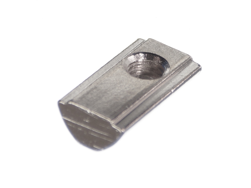 Møtrikken kan skubbes ind i serie 20 profilernes 6mm slot, hvorefter fjederen holder den på plads.