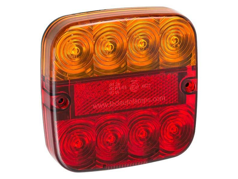 E-godkendt trailer lygte med kørelys, bremselys og blinklys i et klassiskt udseende. Lygten har 4 kraftige røde LEDs og 4 kraftige gule LEDs til henholdsvis baglys og blinklys. Lygten fås også med indbygget nummerplade lys, så du undgår at skulle montere ekstra nummerplade-lygter.